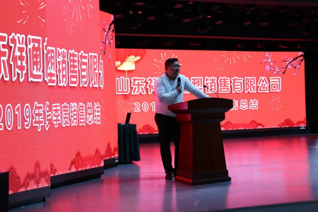 2019年4月7日上午9時,山東祥通橡塑銷售有限公司一季度銷售工作會議在集團祥通新雅多功能演播廳召開。會議對集團公司一季度銷售工作進行了認(rèn)真地總結(jié)和分析,并依據(jù)各地區(qū)市場一季度的客觀情況對銷售部、區(qū)域直營部、公司直營部二季度任務(wù)目標(biāo)進行了個別調(diào)整,為沖刺二季度全面完成上半年銷售任務(wù)和目標(biāo)進行了再研判和再部署。集團公司董事長張建魯、總經(jīng)理張振宇、副總經(jīng)理王冬、銷售總監(jiān)王長友和各銷售部、區(qū)域直營部經(jīng)理等相關(guān)部室及一線銷售人員約60多人出席了會議。