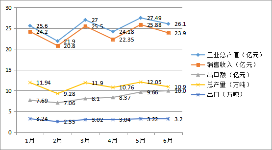 統(tǒng)計(jì)數(shù)據(jù)顯示,6月,國內(nèi)橡膠助劑工業(yè)總產(chǎn)值為26.1億元,同比(下同)增長21.45%;銷售收入23.9億元,增長13.38%;出口額10億元,增長34%。