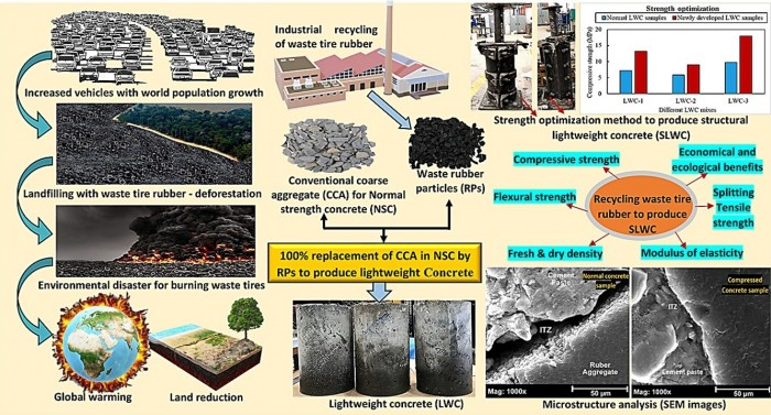 與用傳統(tǒng)方法生產的100%輪胎骨料混凝土相比,新混凝土的抗壓、抗折和抗拉強度分別提高了97%、59%和20%。