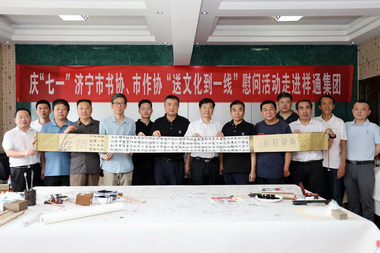 為慶祝中國(guó)共產(chǎn)黨成立103周年,謳歌黨的光輝歷程和豐功偉績(jī),弘揚(yáng)中華民族的傳統(tǒng)文化。6月29日上午,濟(jì)寧市書(shū)協(xié)、市作協(xié)、大魯藝書(shū)畫(huà)院聯(lián)合文藝志愿者小分隊(duì)走進(jìn)濟(jì)寧高新區(qū)祥通集團(tuán),開(kāi)展慶“七一”送文化到一線文藝慰問(wèn)活動(dòng),以書(shū)法藝術(shù)傳承紅色經(jīng)典,增強(qiáng)文化自信,弘揚(yáng)大國(guó)工匠精神,慰問(wèn)堅(jiān)守在生產(chǎn)一線的黨員職工。市書(shū)協(xié)主席謝長(zhǎng)偉,市作協(xié)主席張建魯,市書(shū)協(xié)副主席王超,市作協(xié)秘書(shū)長(zhǎng)周中祥,市書(shū)協(xié)副秘書(shū)長(zhǎng)張玉猛、張克,市書(shū)協(xié)理事秦明,大魯藝書(shū)畫(huà)院黨支部書(shū)記、副院長(zhǎng)張瑞祥、副院長(zhǎng)王盡文等文藝志愿者參加活動(dòng)。