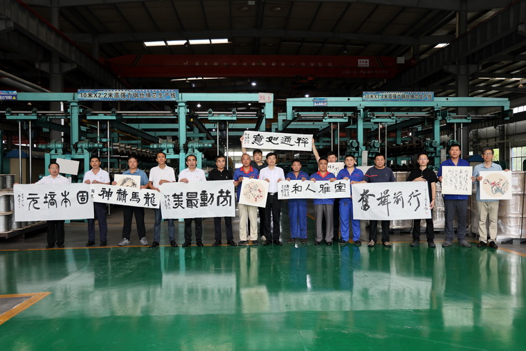 在書(shū)法作品贈(zèng)送環(huán)節(jié),祥通集團(tuán)黨支部書(shū)記李勉祥陪同謝長(zhǎng)偉主席、王超副主席帶領(lǐng)文藝志愿者們帶著作品進(jìn)車(chē)間、進(jìn)廠房,慰問(wèn)堅(jiān)守在生產(chǎn)一線的黨員職工代表,為黨員們送上了一幅幅精美的書(shū)畫(huà)作品,以“文化大餐”激勵(lì)車(chē)間一線黨員堅(jiān)定信心,用雙手創(chuàng)造美好生活的信心,并以書(shū)法藝術(shù)的形式向他們表示誠(chéng)摯的問(wèn)候和祝福。