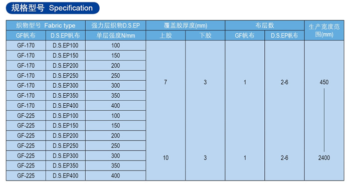 1、近工作面強力層上方覆蓋一層特制耐熱織物(GF帆布)。強力層采用高模低縮聚酯帆布(D.S.EP帆布)。