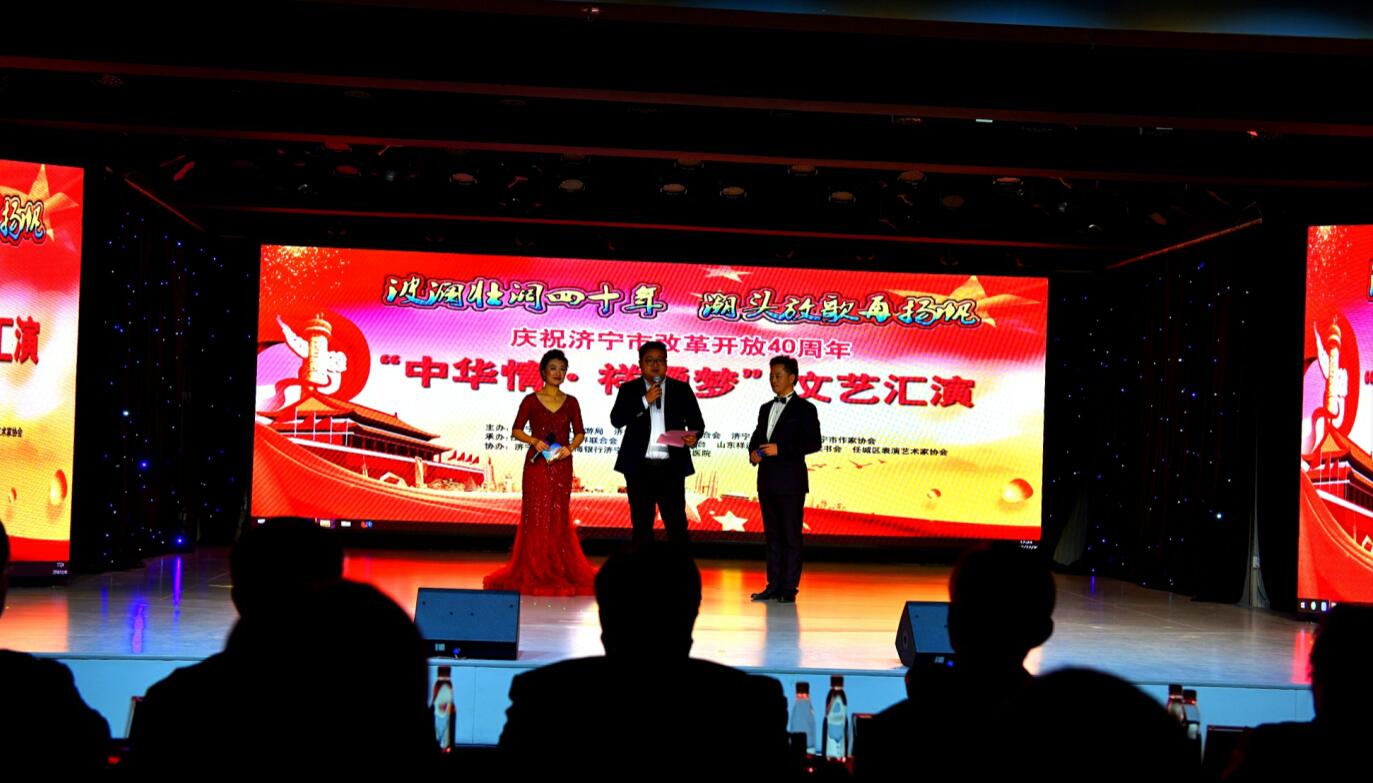 春華秋實(shí)四十載,書(shū)寫(xiě)偉大變革新華章;砥礪奮進(jìn)新時(shí)代,踏上改革開(kāi)放新征程。在全黨全國(guó)上下深入學(xué)習(xí)貫徹習(xí)近平總書(shū)記在慶祝改革開(kāi)放40周年大會(huì)上的重要講話精神之際,12月30日下午,由濟(jì)寧市文化和旅游局、濟(jì)寧市文聯(lián)、濟(jì)寧廣播電視臺(tái)、濟(jì)寧市作協(xié)主辦,任城區(qū)文聯(lián)、任城區(qū)廣播電視臺(tái)、山東祥通集團(tuán)、濟(jì)寧市讀書(shū)協(xié)會(huì)、任城區(qū)表演藝術(shù)家協(xié)會(huì)承辦,濟(jì)寧銀行、威海銀行濟(jì)寧分行、濟(jì)寧博仕醫(yī)院協(xié)辦的濟(jì)寧市慶祝改革開(kāi)放40周年暨“中華情 祥通夢(mèng)″文藝匯演在濟(jì)寧高新區(qū)祥通工業(yè)園內(nèi)六樓祥通新雅多功能演播廳濃情上演。出席文藝匯演的領(lǐng)導(dǎo)有:濟(jì)寧市人大原第一副主任、黨組書(shū)記祝金煥,濟(jì)寧市人大原第一副主任連廣生,濟(jì)寧市人大原副主任許謙迎,濟(jì)寧市人大原副主任殷允嶺,濟(jì)寧市政協(xié)副主席李良品,濟(jì)寧市原市委常委、政協(xié)副主席張開(kāi)朗,濟(jì)寧技工學(xué)院黨委書(shū)記、院長(zhǎng)樊剛,濟(jì)寧市委黨校黨委書(shū)記、常務(wù)副校長(zhǎng)孫琪 ,濟(jì)寧市委宣傳部常務(wù)副部長(zhǎng)孫愛(ài)民,濟(jì)寧市文化和旅游局局長(zhǎng)張弢 ,濟(jì)寧市廣播電視臺(tái)黨委書(shū)記、臺(tái)長(zhǎng)張作昌,濟(jì)寧市文聯(lián)主席周長(zhǎng)征,濟(jì)寧市人大原秘書(shū)長(zhǎng)彭廣含,濟(jì)寧市任城區(qū)人大原副主任張曉平,孔子研究院副院長(zhǎng)陳曉霞,濟(jì)寧市財(cái)政局副局長(zhǎng)王玉留,濟(jì)寧市公安局副局長(zhǎng)喬培戰(zhàn),任城區(qū)武裝部政委溫明強(qiáng),任城區(qū)政府副區(qū)長(zhǎng)趙文衛(wèi),濟(jì)寧市消防支隊(duì)副政委井源,濟(jì)寧威海銀行行長(zhǎng)許占東,濟(jì)寧市作協(xié)主席張建魯,濟(jì)寧市作協(xié)副主席汪林, 山東省書(shū)協(xié)副主席、濟(jì)寧市書(shū)協(xié)主席謝長(zhǎng)偉,濟(jì)寧報(bào)業(yè)傳媒集團(tuán)副總經(jīng)理史忠強(qiáng),任城區(qū)委宣傳部副部長(zhǎng)、任城區(qū)文聯(lián)黨組書(shū)記、主席陸振,任城區(qū)廣播電視臺(tái)臺(tái)長(zhǎng)杜慶學(xué),兗州區(qū)文聯(lián)主席張金鵬,兗州區(qū)音樂(lè)家協(xié)會(huì)主席王曼等特邀嘉賓、社會(huì)各界知名人士代表和祥通一線職工及群眾500多人現(xiàn)場(chǎng)觀看了文藝匯演。