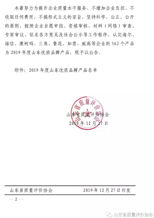 201912月27日,山東省質(zhì)量評價協(xié)會在品牌評價實驗室發(fā)布了2019年度山東優(yōu)質(zhì)品牌產(chǎn)品公告名單。海爾、海信、祥通橡塑、澳柯瑪、三角、魯花、如意、威高等企業(yè)的563個產(chǎn)品被認定為2019年度山東優(yōu)質(zhì)品牌產(chǎn)品。