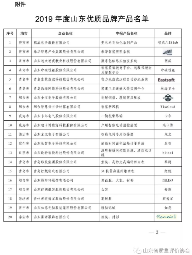 關(guān)于2019年度山東優(yōu)質(zhì)品牌產(chǎn)品認定結(jié)果的公告