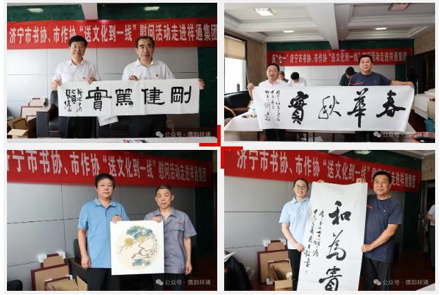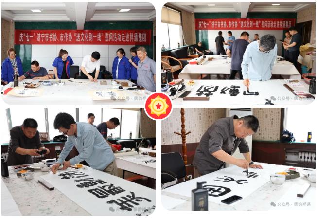 為慶祝中國(guó)共產(chǎn)黨成立103周年,謳歌黨的光輝歷程和豐功偉績(jī),弘揚(yáng)中華民族的傳統(tǒng)文化。6月29日上午,濟(jì)寧市書(shū)協(xié)、市作協(xié)、大魯藝書(shū)畫(huà)院聯(lián)合文藝志愿者小分隊(duì)走進(jìn)濟(jì)寧高新區(qū)祥通集團(tuán),開(kāi)展慶“七一”送文化到一線文藝慰問(wèn)活動(dòng),以書(shū)法藝術(shù)傳承紅色經(jīng)典,增強(qiáng)文化自信,弘揚(yáng)大國(guó)工匠精神,慰問(wèn)堅(jiān)守在生產(chǎn)一線的黨員職工。市書(shū)協(xié)主席謝長(zhǎng)偉,市作協(xié)主席張建魯,市書(shū)協(xié)副主席王超,市作協(xié)秘書(shū)長(zhǎng)周中祥,市書(shū)協(xié)副秘書(shū)長(zhǎng)張玉猛、張克,市書(shū)協(xié)理事秦明,大魯藝書(shū)畫(huà)院黨支部書(shū)記、副院長(zhǎng)張瑞祥、副院長(zhǎng)王盡文等文藝志愿者參加活動(dòng)。